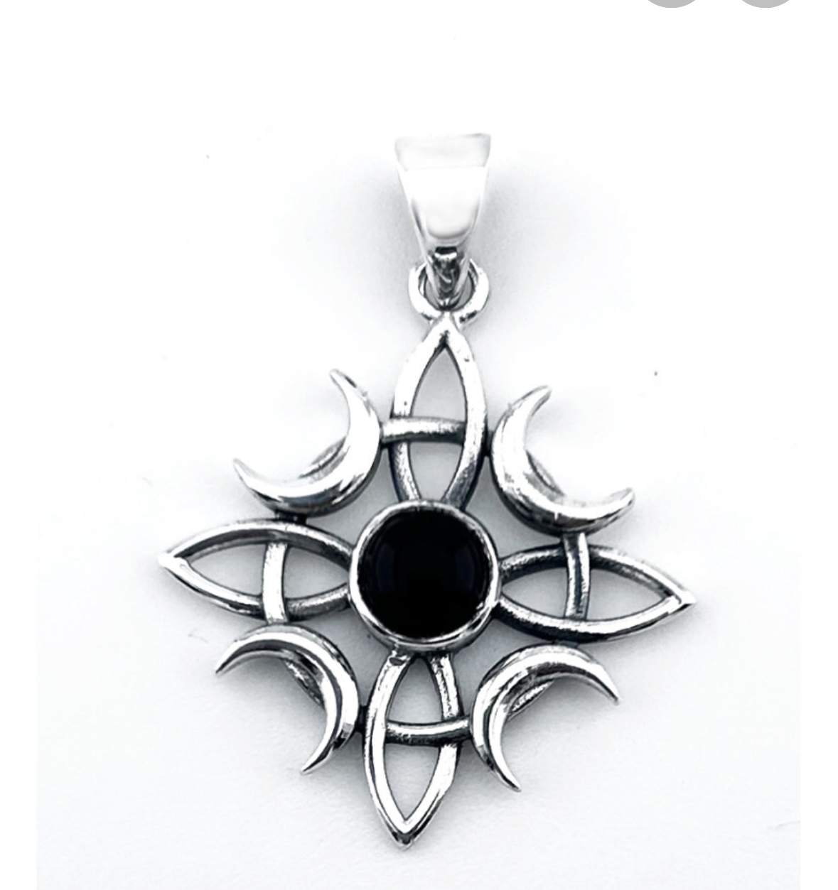 Diseño: Intrincado Nudo de Bruja con un cabujón central de Ónix negro.