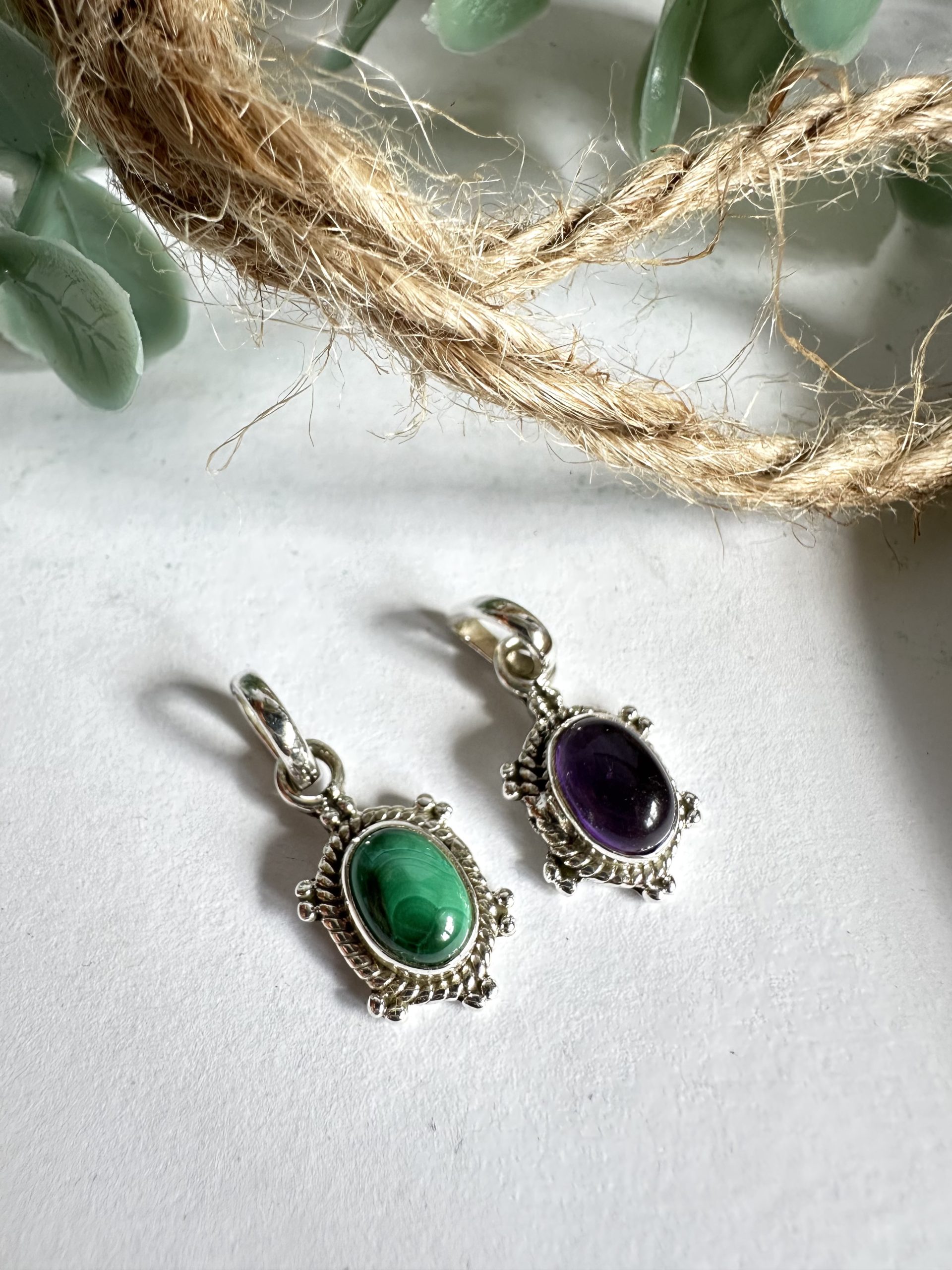 Este delicado colgante, engarzado en auténtica Plata de Ley 925, presenta una gema ovalada de Malaquita con sus característicos y fascinantes patrones verdes.