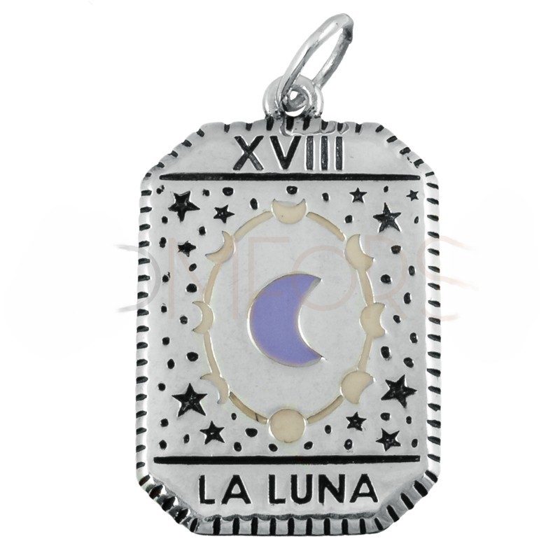 Colgante de plata de ley 925ml, con un tamaño de 20mm de alto por 14mm de ancho. De forma rectangular, con un diseño estampado en él con toques de color esmaltado.