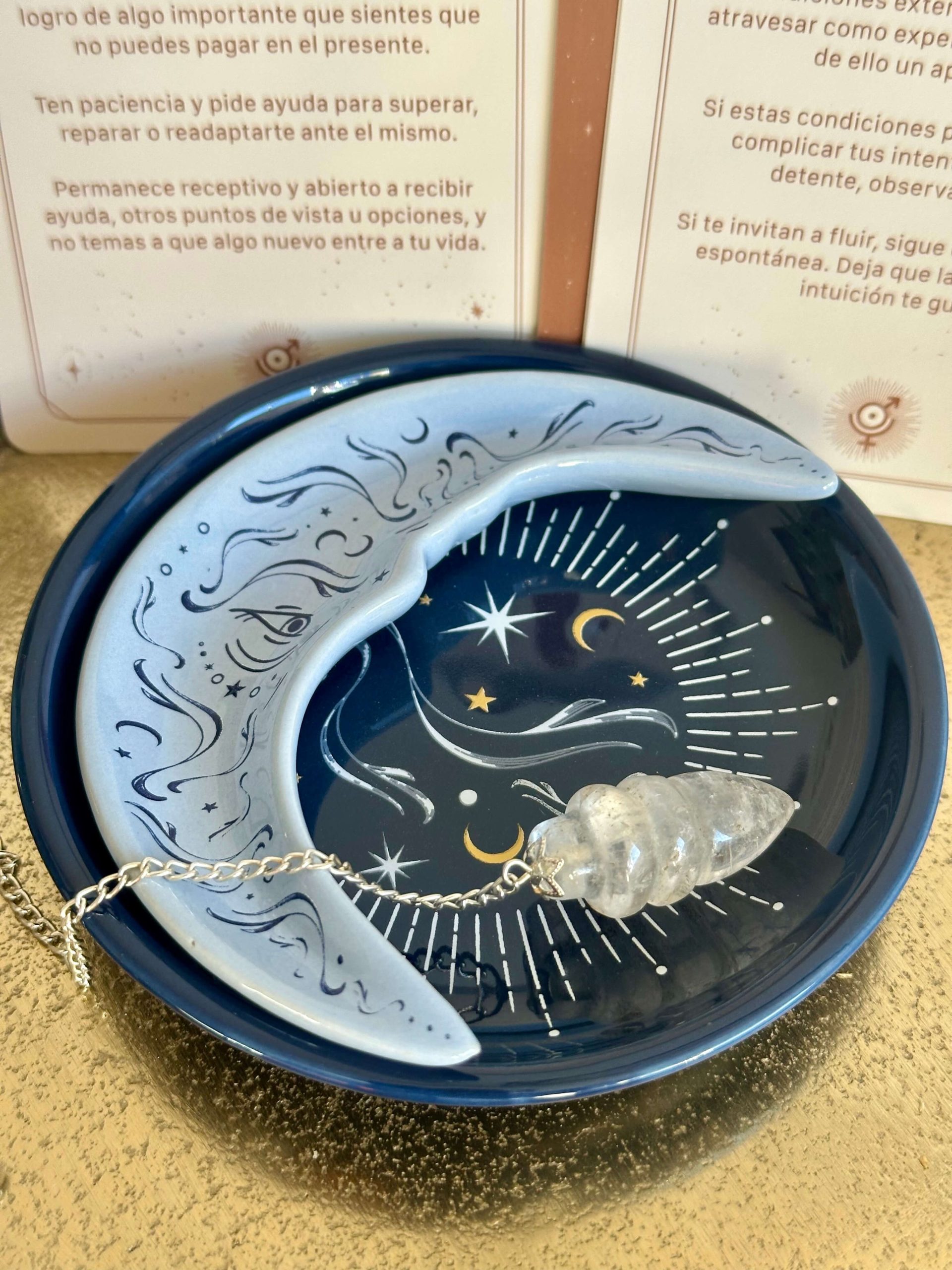 Bandeja Interior (Luna): Una pieza con forma de Luna creciente en un tono azul celeste suave con detalles de ojos, estrellas y remolinos, que simboliza la intuición y los ciclos.