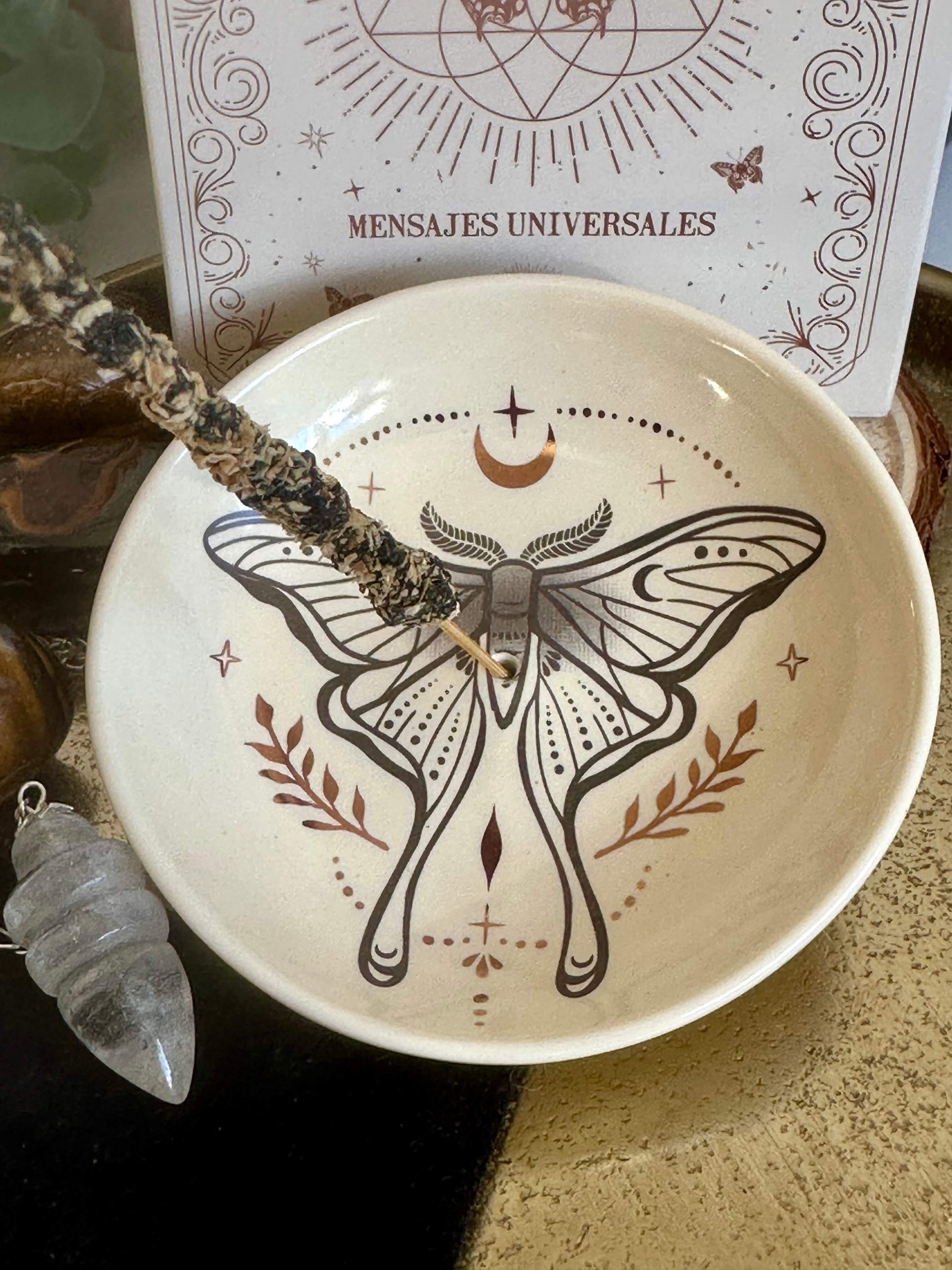 Diseño Místico: El plato está decorado con una gran polilla o mariposa de la Luna, símbolo de transformación, luz en la oscuridad e intuición a través de la noche.