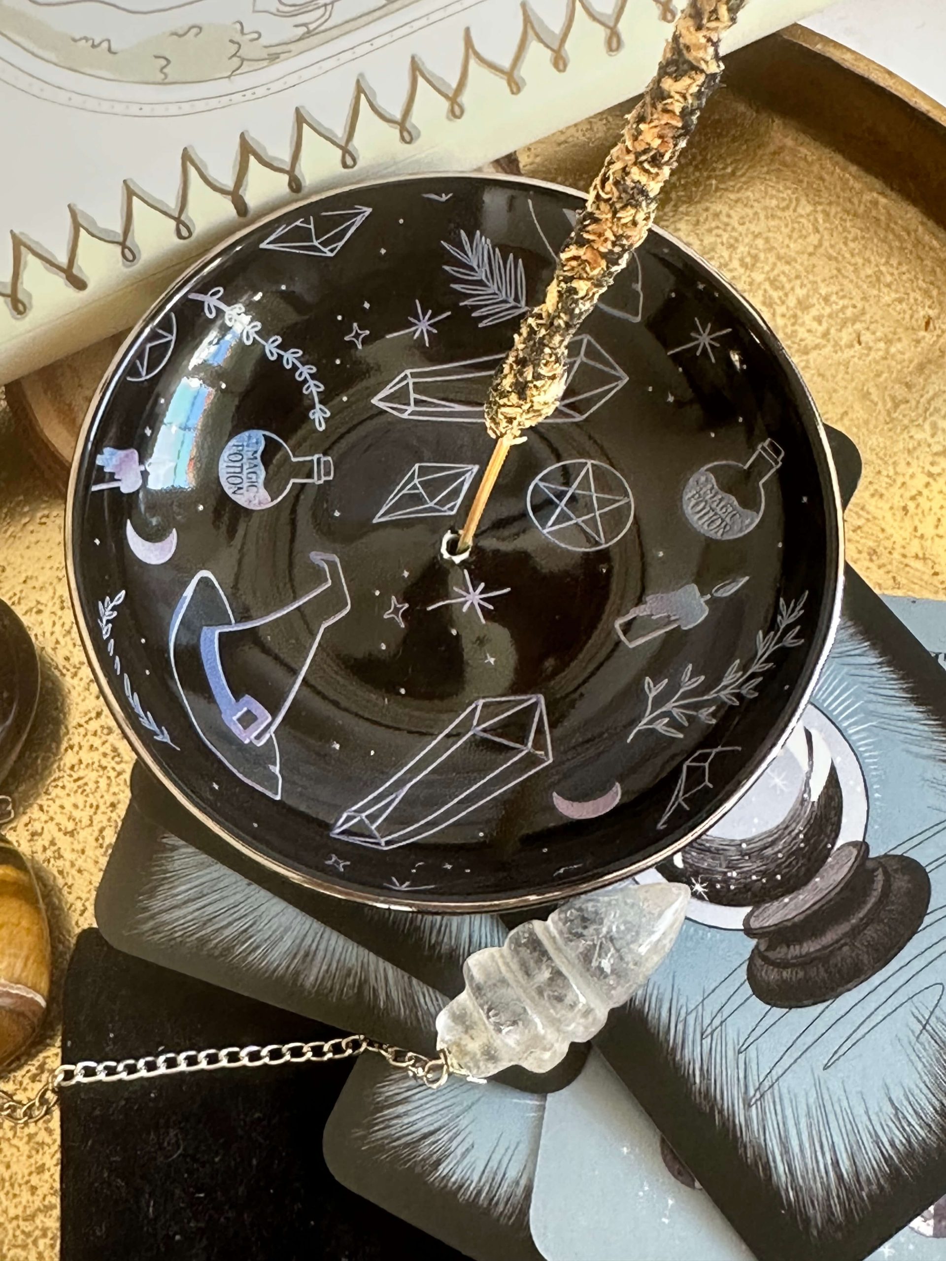 Funciona como porta incienso de varilla (con el orificio central) y como una bandeja temática perfecta para cargar cristales o exhibir tus herramientas de adivinación.