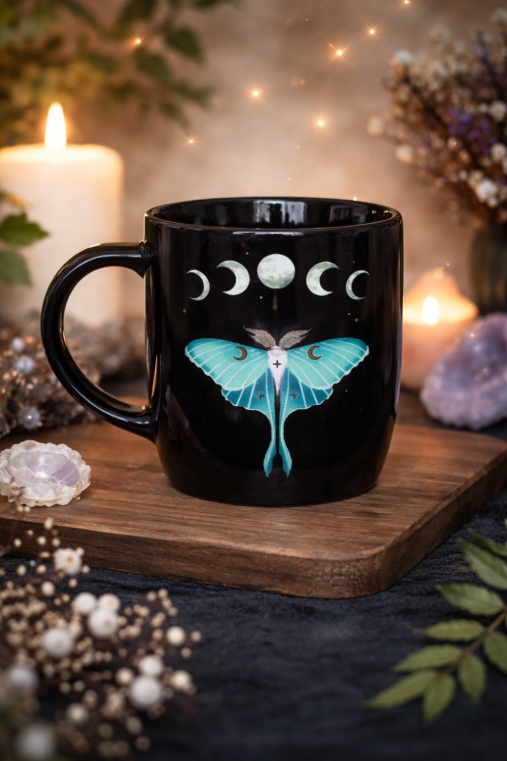 Dale un toque de encanto a tu taza matutina con esta taza de cerámica de polilla luna de bosque . Esta taza de cerámica negra presenta un bonito diseño de polilla luna, con fases lunares, estrellas y flores. Tiene una capacidad de 340 ml y es apta para lavavajillas y microondas.