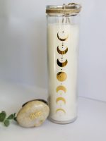 Enciende la magia. Esta vela blanca, esbelta y elegante, lleva grabadas en un brillante dorado las fases completas de la luna. Perfecta para rituales, meditación o simplemente para añadir un toque místico y sereno a tu espacio.